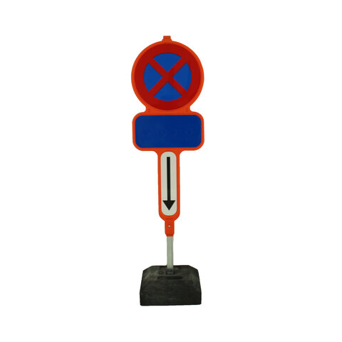 Official parking prohibition sign made of HDPE and coloured in mass for indicating a parking or idling prohibition. Stackable and fitted with reflective film for good visibility. Ideal for moving or events.